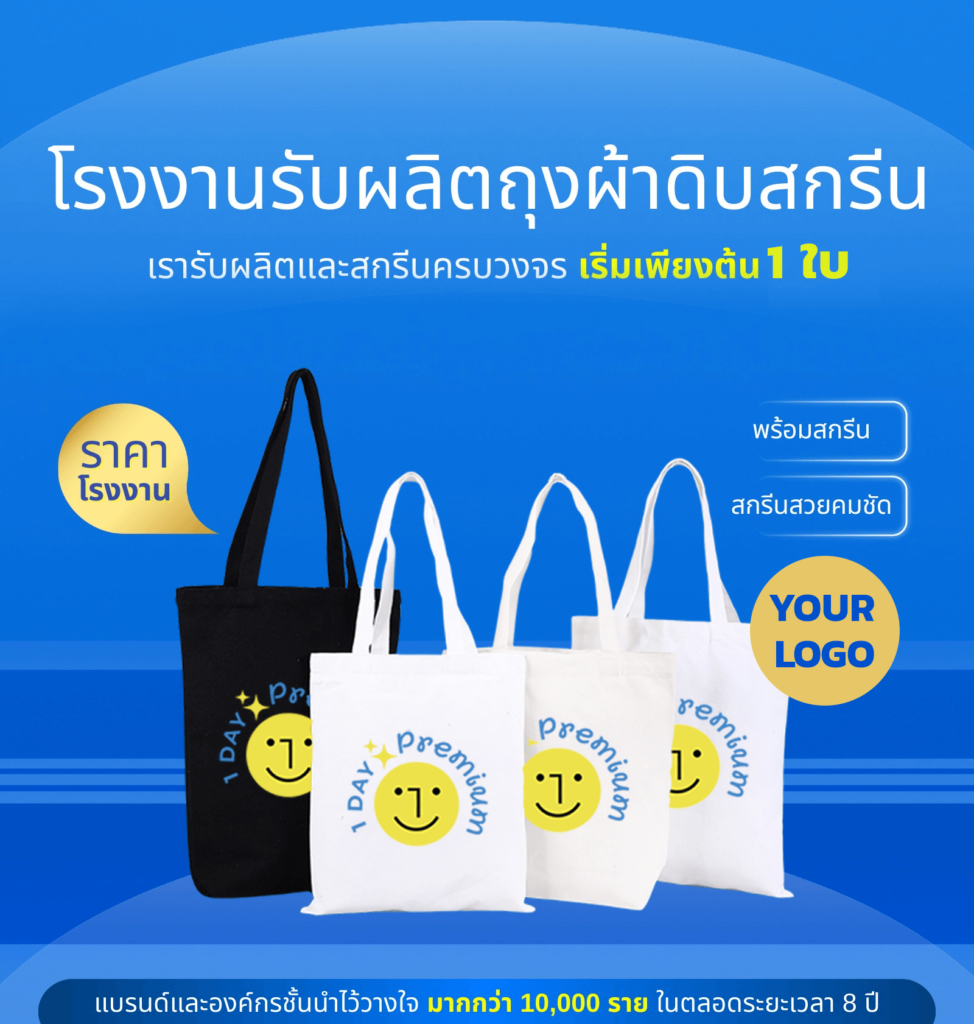 เริ่มต้นสกรีนเพียง 1 ใบ โดยใช้ถุงผ้าสำเร็จรูปที่โรงงานมีในสต็อกได้เลย