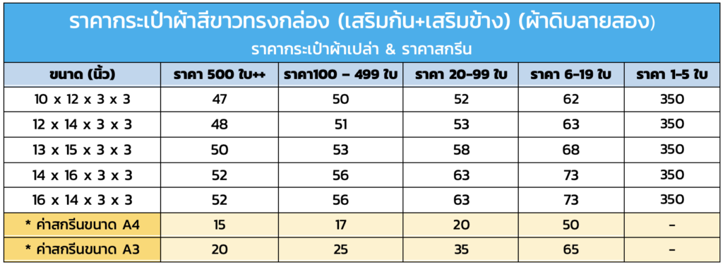 ราคาถุงผ้าดิบทรงแบนไม่รวมบริการสกรีน ลูกค้าสามารถสั่งซื้อเฉพาะถุงผ้าดิบเปล่า หรือ ใช้บริการสกรีนครบวงจรกับโรงงานได้